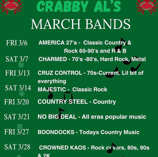 To book a band at Crabby Al's, send an email to crabbyalsbands@gmail.com.